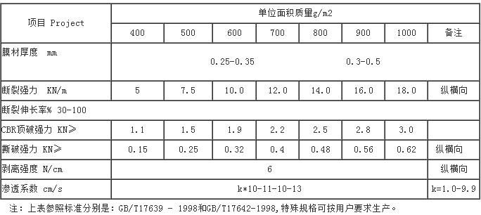 復(fù)合土工膜是用土工織物與土工膜復(fù)合而成的不透水材料,它主要用于防滲,復(fù)合土工膜分為一布一膜和兩布一膜、寬幅4-6m,重量為200-1500g/m2,抗拉、抗撕裂、頂破等物理力學(xué)性能指標(biāo)高,能滿足水利、市政、建筑、交通、地鐵、隧道等土木工程需要。由于其選用高分子材料且生產(chǎn)工藝中添加了防老化劑,故可在非常規(guī)溫度環(huán)境中使用。